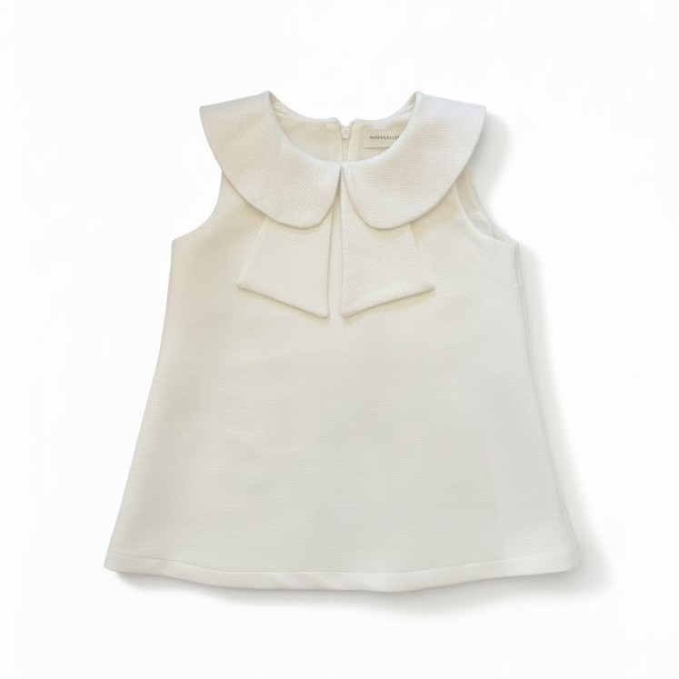 - Özellikler: Kolsuz tasarım, geniş bebe yaka, ön kısımda sabit fiyonk aksesuarı.