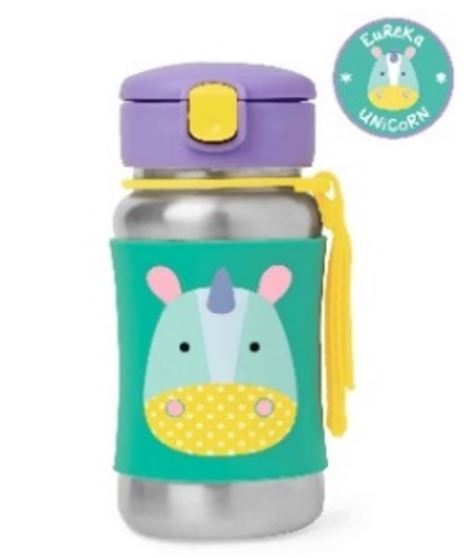 Çocuklarımız için özel üretilen paslanmaz çelik su şişesi, kaymaz silikon kılıfı ile minik elleri soğuk yüzeylerden korur. Özel Skip Hop Zoo karakterlerimize sahip bu özel şişe her şeye bağlanan kullanışlı kayışın yanı sıra esnek pipetin temiz kalması için açılır kapanır bir kapağa da sahiptir.Özellikleri: